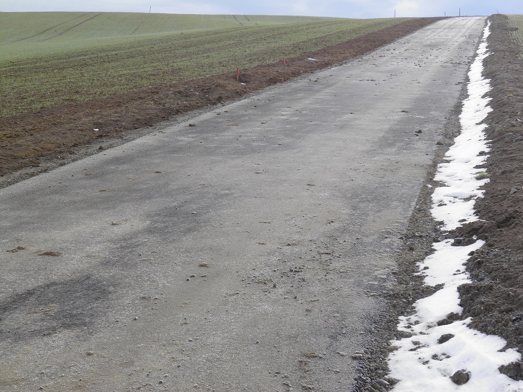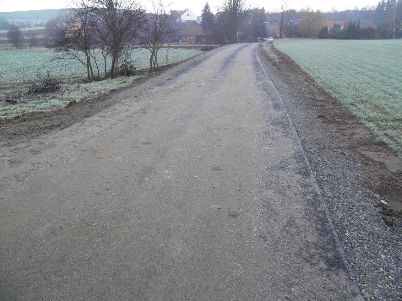Účelová komunikace kategorie P 4,5/30 v délce 463 m. Jízdní pruh šířky 4 m z asfaltobetonu se zpevněnými krajnicemi šířky 0,25 m. Odvodnění zemní pláně a komunikace je v úseku 0,003 – 0,110 km řešeno jednostrannou vnitřní drenáží z trubek PVC DN 100 mm uloženou pod krajnicí vozovky s vyústěním do odvodňovacího záchytného žlabu na začátku komunikace. V úseku 0,120 – 0,304 je těleso komunikace odvodněno cestním příkopem, který je zaústěn do vodoteče. Úsek 0,310 – 0,463 je odvodněn drenáží s vyústěním do cestního příkopu.