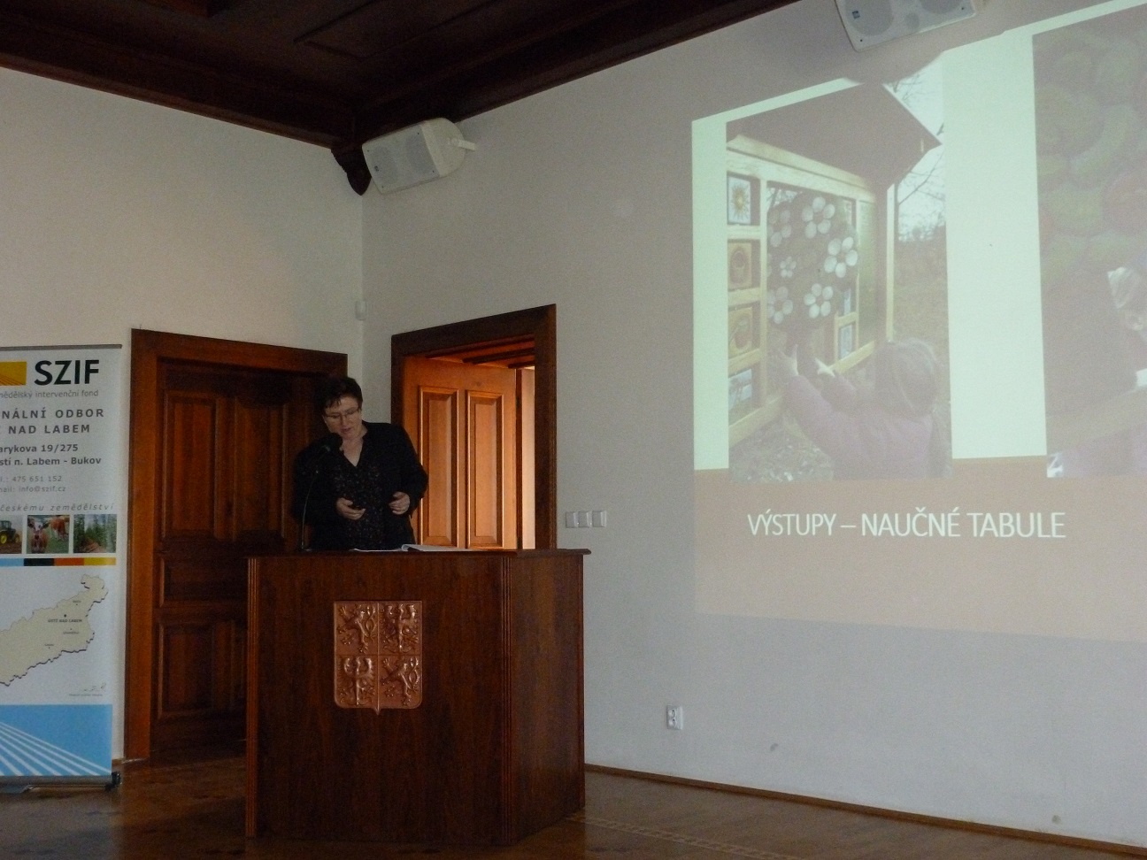 Mgr. Lucie Matulová z kanceláře Ústřední výkonné rady Českého svazu ochránců přírody představila společné zařízení Biocentrum Mokroš, vybudované v katastrálním území Mořice v okrese Prostějov a navazující projekt “Blíž přírodě”. Ing. Markéta Pošíková, ředitelka MAS Podlipansko, seznámila přítomné s realizovaným projektem PRV Středočeská ovocná stezka a Romana Sedláčková z Regiocentra, o. p. s. představila síť hipostezek na Děčínsku.