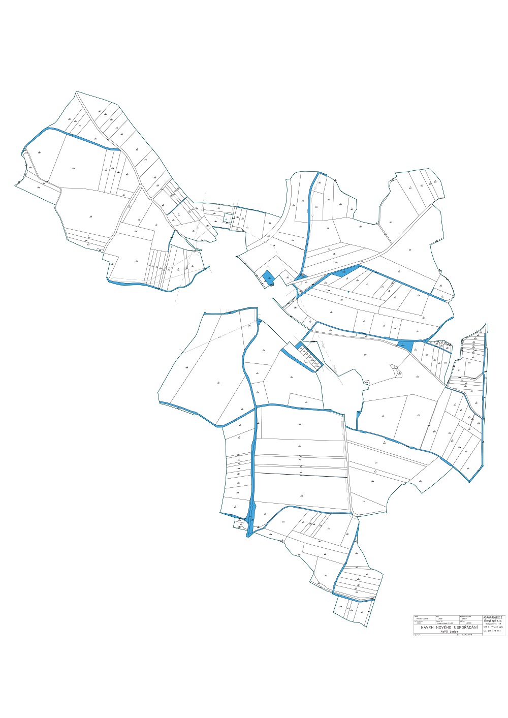 Soupis nových pozemků je vlastně „výstup“, tedy přehled nově navrženého umístění pozemků pro každý list vlastnictví s oceněním pozemků podle BPEJ s ceníkem použitých kódů bez srážek a přirážek, výměrou a vzdáleností od centrálního bodu odsouhlaseného na úvodním jednání (pro k.ú. Ledce roh autobusové zastávky, pro k.ú. Klášter n. D. střed makovice kapličky), druhem pozemku včetně omezení vyplývajících z evidovaných právních vztahů (což jsou např. věcná břemena, zástavní právo, předkupní právo apod.)